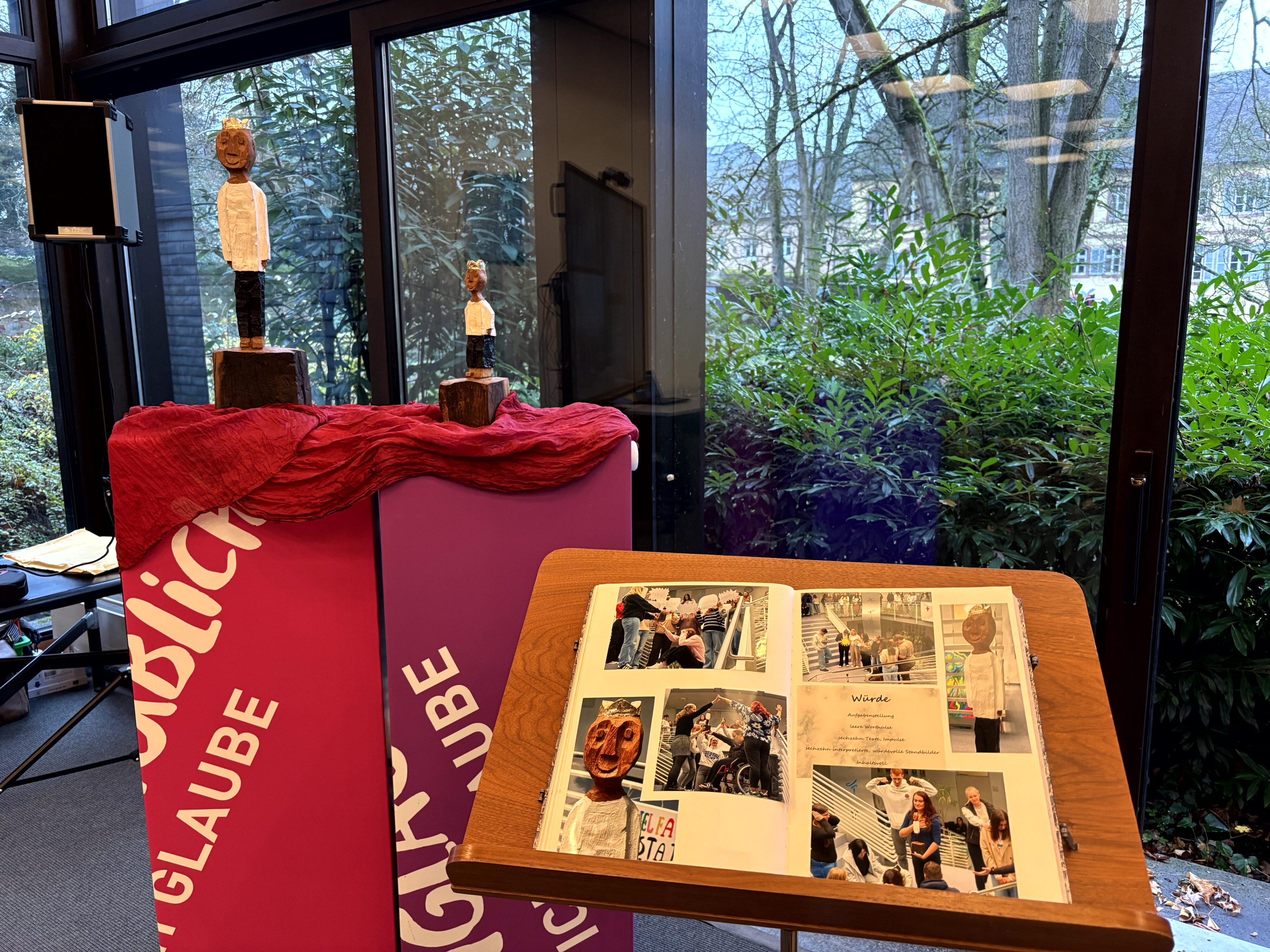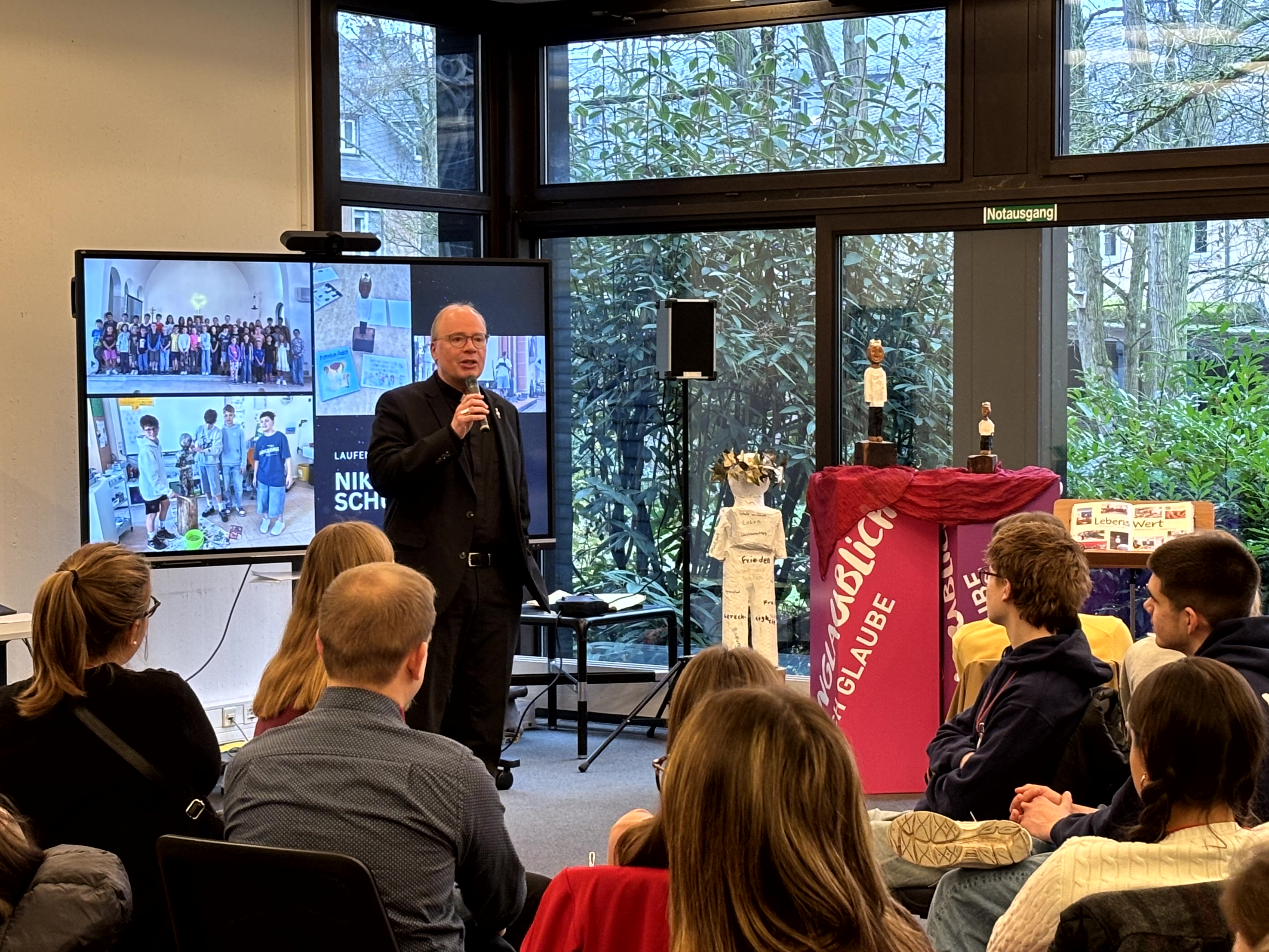 Bischof Ackermann zeigte sich im Gespräch mit den Schüler*innen beeindruckt davon, „wie sehr Euch die Figur inspiriert hat“. Zwar sei die Figur „kunstvoll gemacht“, aber „man muss keine Angst haben, sie in die Hand zu nehmen“, sagte er. Durch das Symbol der Krone werde zudem direkt deutlich, worum es geht: „Es gibt Würde und Glanz für jeden Menschen“ – dafür stehe die Figur in besonderer Weise. „Ihr habt das durchbuchstabiert“, dankte er den jungen Leuten.
