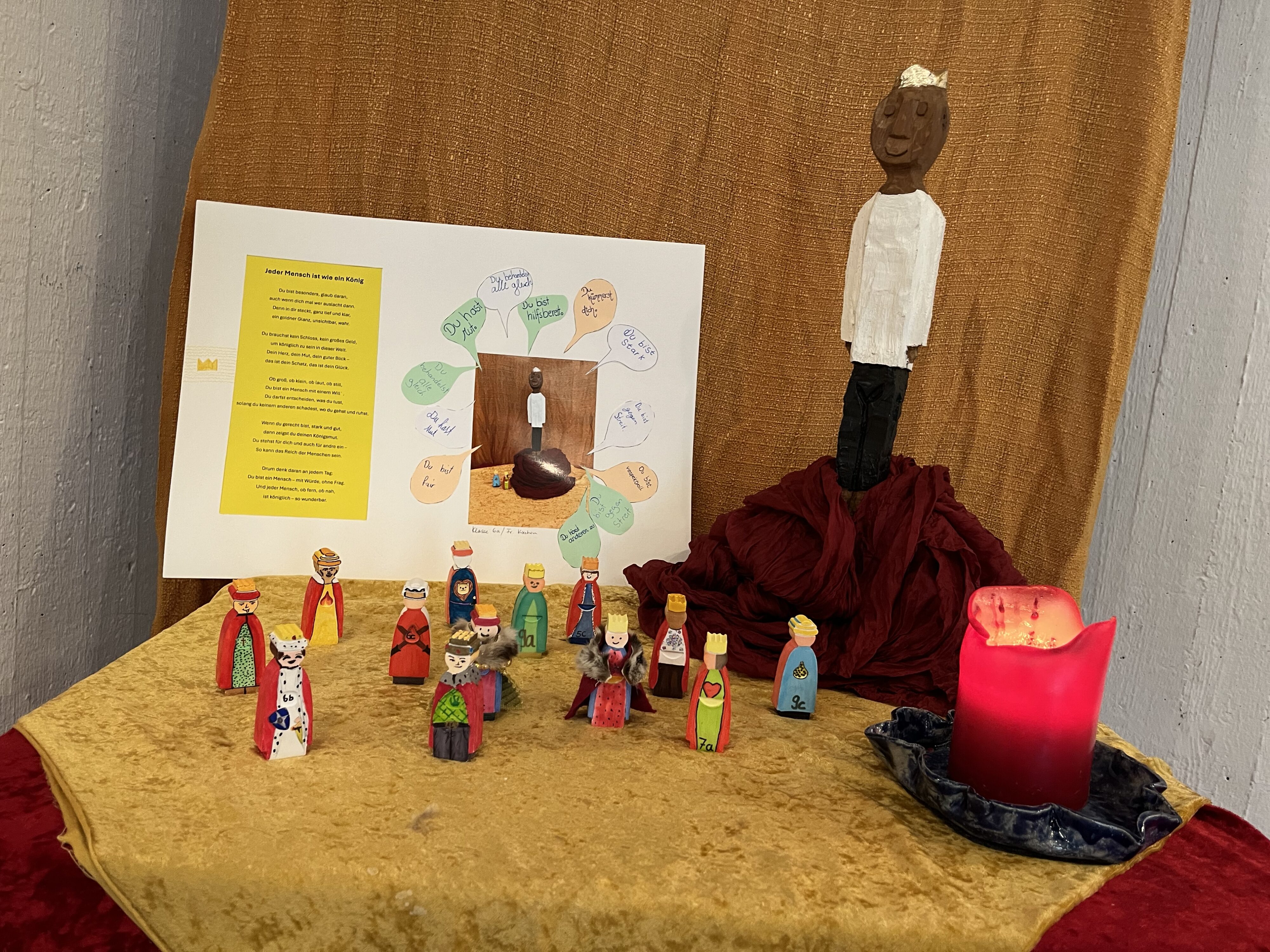 Jede Klasse formte einen kleinen „Pilger der Hoffnung“, den sie entsprechend gestaltete und zu dem großen König stellte. So versammelte sich die Schulgemeinschaft St. Maximin.